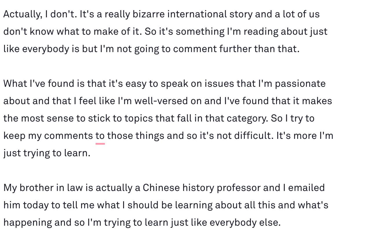 And, while Morey was attacked over Hong Kong, there's the Uighurs and more. C'mon, Steve, and others? That said, Morey had crickets until worried about a personal friend in Hong Kong. So, not passionate because it's not personal? Well, Steve, neither you nor I (I think) PERSONALLY knows a Guatemalan immigrant family separated at the border, but both of us protest.